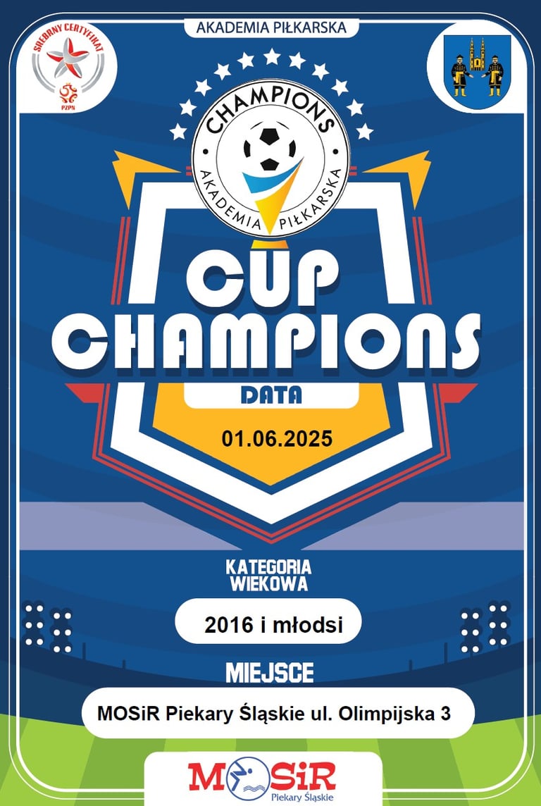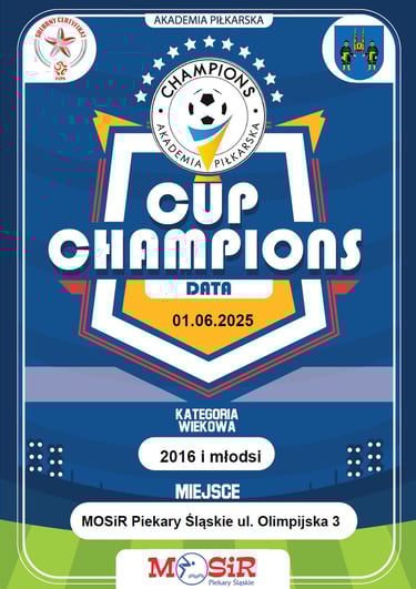 Zapraszamy na turniej piłkarski organizowany przez Akademie Piłkarską Champions w Piekarach Śląskich. Turniej Champions CUP odbędzie 01.06.2025 (Niedziela)